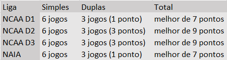 Na Divisão 2 da NCAA acontece a mesma quantidade de jogos, porém os pontos são contados de outra maneira. As três duplas são contadas como três pontos individuais (cada jogo vale um ponto na somatória). Nesse formato, ganha o time que chegar ao total de 5 (cinco) pontos.